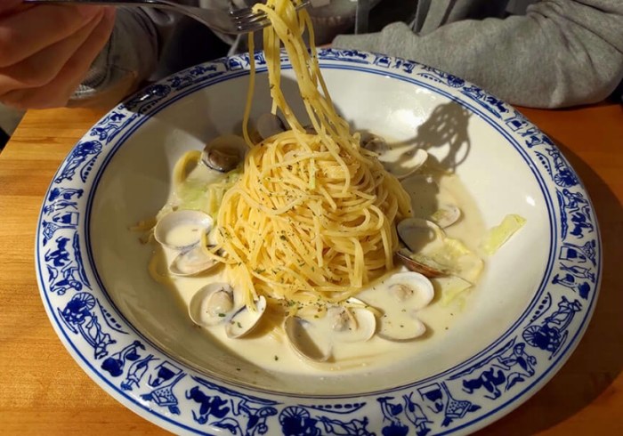 - 這道經典的清炒款,最能吃出功力。艾隆的蒜香、辣椒香氣夠勁,培根煎得焦香,重點是份量真的多!男生也能吃飽飽。是預算有限時,解「一中義大利麵」饞的最佳選擇。非常適合口袋空空又想大口吃麵的日子。