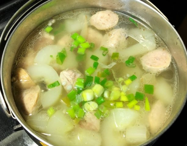- 煮湯圓: 另起一小鍋滾水,將客家鹹湯圓(通常裡面有包豬肉餡)煮熟。湯圓浮起、膨脹後,撈起瀝乾備用。注意:湯圓不要直接丟到大黃瓜湯鍋裡煮!糯米粉會讓整鍋湯變糊!