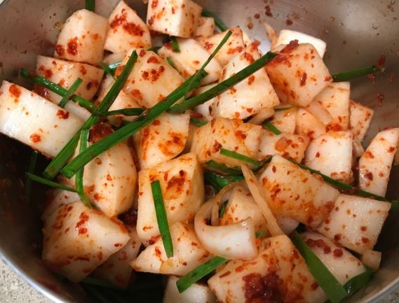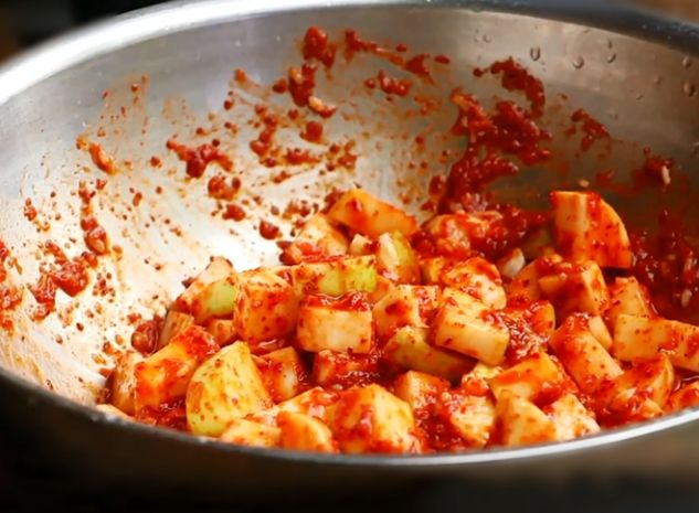 - 加入辣椒粉: 撒上韓式辣椒粉。這時千萬不要一股腦倒下去!先下一半的量,用乾淨的手或筷子(戴手套更好,不然手會染色!)仔細拌勻,看看顏色和辣度是否滿意,再決定是否加剩下的。拌勻後,蘿蔔會呈現淡淡的粉紅色,很誘人!