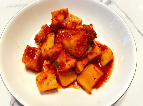 A:當然可以不加辣椒粉!做出來就是白色的韓式醃蘿蔔,在韓國也很常見,稱為"백무채"。味道一樣是酸甜爽脆,非常解膩。重點在醃汁的比例和殺青去澀的步驟有沒有做好。不加辣椒粉版本,吃的就是蘿蔔的清甜和醋的爽口!所以怕辣或想換口味的朋友,放心去掉辣椒粉吧!這絕對還是正宗的韓式風味。